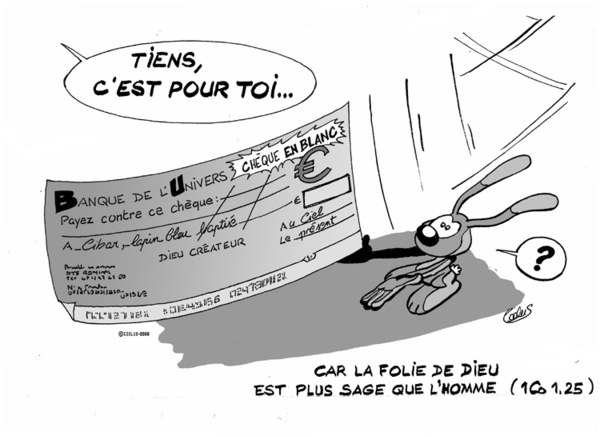 -Un chèque en blanc descend du ciel. Il est spécifié qu’il s’adresse au lapin bleu baptisé. Quand Dieu donne sa Vie Divine, à travers le baptême, il nous donne TOUT (un chèque en blanc)
