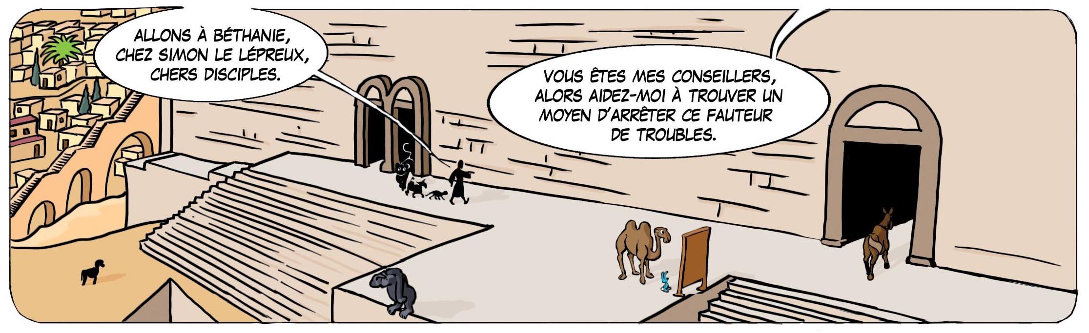 -Si le début de l’album est un foisonnement de vie, on arrive peu à peu à la contemplation. Certaines images prennent toute une double page pour nous faire plonger dans le mystère. Elvine a tout particulièrement soigné les ambiances dans le choix de ses couleurs. Coolus a multiplié les plans de Jérusalem en plongée et s’est plus minutieusement documenté sur Jérusalem, le Temple, la ville…