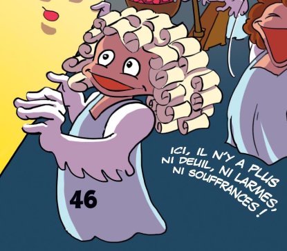 Ici, l’ange ouvre le tombeau, le lapin ressuscite… et a l’air vachement surpris…