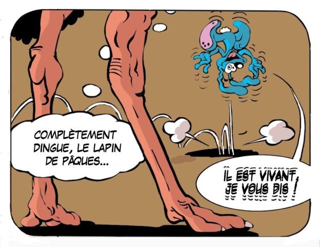 La prise de vue qui a été choisie nous met aux pieds de l’autruche, pour montrer tout son poids par rapport à la légèreté et même l’insignifiance du lapin bleu en arrière-fond. Il ne vaut pas grand chose en lui-même, mais il est faible et un peu dingo. Voilà pourquoi il a été choisi par Dieu.