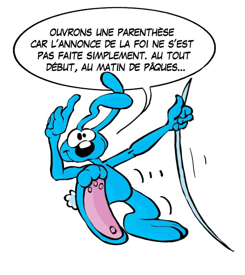 A partir de la page 44, le lapin bleu reprend sa place d’aîné dans la foi; celui qui accompagne, qui explique, qui témoigne.