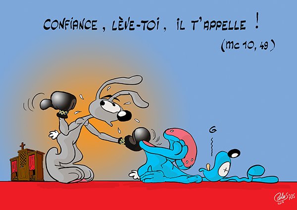 -Dans l’évangile de ce jour, il est question d’un aveugle que la foule rabroue. Puis, lorsque Jésus s’intéresse à lui, la foule s’intéresse à lui aussi. Sur le dessin, on retrouve le thème : le lapin bleu vient de faire rouer de coups et puis comme Jésus l’appelle, le lapin gris devient subitement tout gentil avec lui.