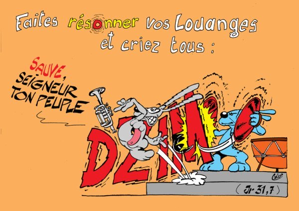 Dans la parole de ce dessin, il y a deux choses : la louange (le verbe utilisé pour la louange, c’est « louer ») qui résonne, et l’intercession « Sauve ton peuple » (qui était le cri du peuple adressé à Jésus le jour des rameaux)