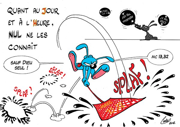Daniel 12,1-3 Psaume 15 Hébreux 10,11-14.18 Marc 13,24-32 Pour aller plus loin. Détails : -Le lapin en arrière fond fait des bulles d’encre noire avec des messages-catastrophe qui font peur. -Il donne une date de la fin du monde… qu’il ne connaît pas car dans la Bible, seul Dieu la connaît. -Plus …