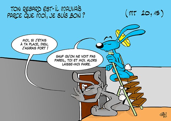 Dieu n’a pas de lunettes… Isaïe 55,6-9 Psaume 144 Philippiens 1,20-27 Matthieu 20,1-16 Pour aller plus loin Détails -Sur ce dessin, le lapin gris regarde une situation à travers le trou d’une serrure. Il ne voit donc pas l’ensemble alors que Dieu (le lapin bleu sur l’échelle) le voit, lui. -La clenche et la …