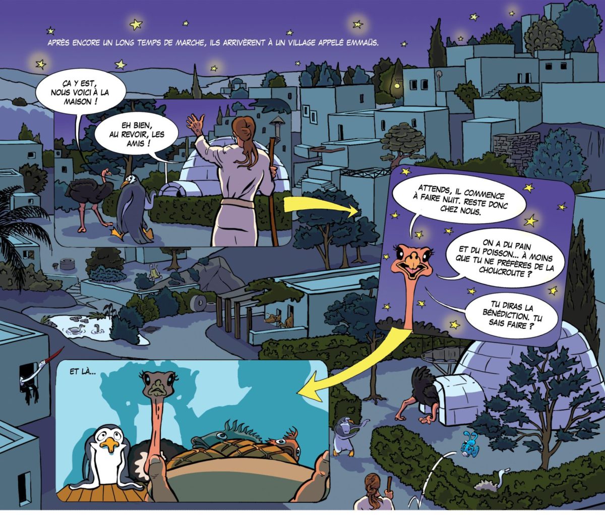 Maintenant, il fait nuit, Tous les trois arrivent à un village appelé Emmaüs. Cette grande image campe le décor dans lequel on poursuit l’action avec de petites cases insérées au milieu qu’on commentera plus tard. Dans ce paysage, on peut trouver toutes sortes de détails rocambolesques pour redonner de la légèreté au récit… A toi …