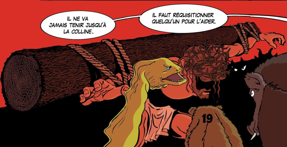 1 P 2,24 Lui-même a porté nos péchés, dans son corps, sur le bois, afin que, morts à nos péchés, nous vivions pour la justice. Par ses blessures, nous sommes guéris. C’est toujours une façon originale de voir Simon de Cyrène aider Jésus à porter sa croix. (au fait, si le chat de la case d’avant …