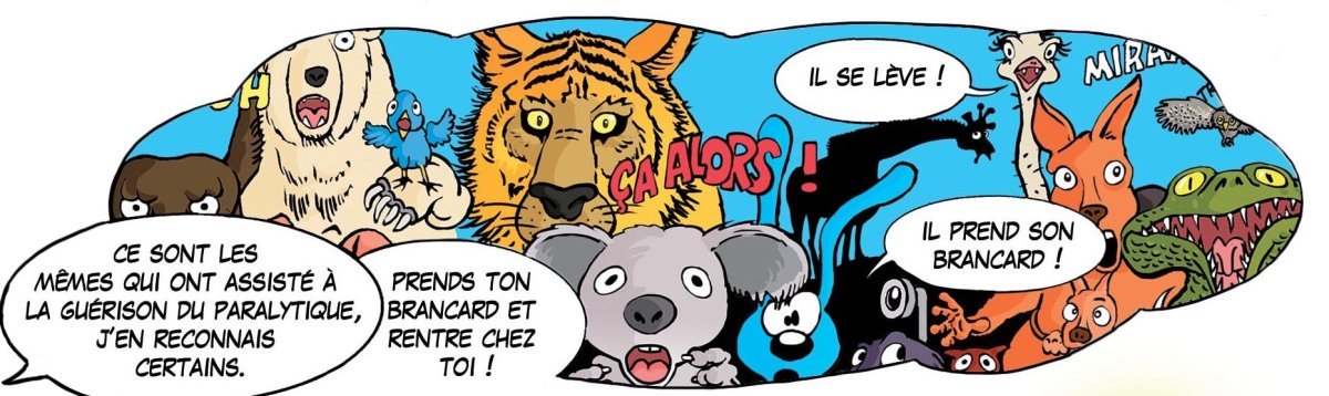 J’ai mis la page en entier pour qu’on voie l’enchaînement des 5 premières cases en longueur. Nicodème essaie d’atténuer le bruit de la foule en se bouchant les oreilles. A partir du moment où il met les pattes sur ses oreilles, les images sont sans paroles, mais on voit des gueules ouvertes. Nicodème qui était …