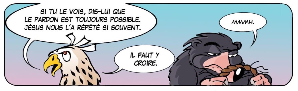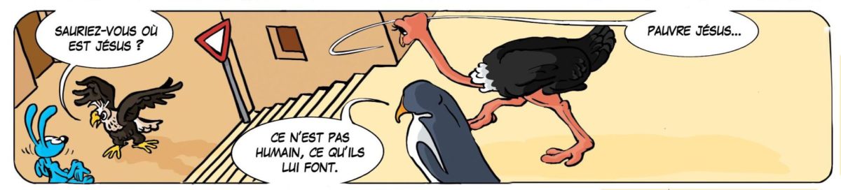 Jean surprend la conversion et la saisit au vol. Sur la page 16 de la BD, cette image est inclinée, la bulle « hep, vous ! » est également écrite en gros caractères et l’aigle prend toute la place dans la case. Ces trois effets graphiques sont présents comme pour donner du relief à l’ensemble de la …