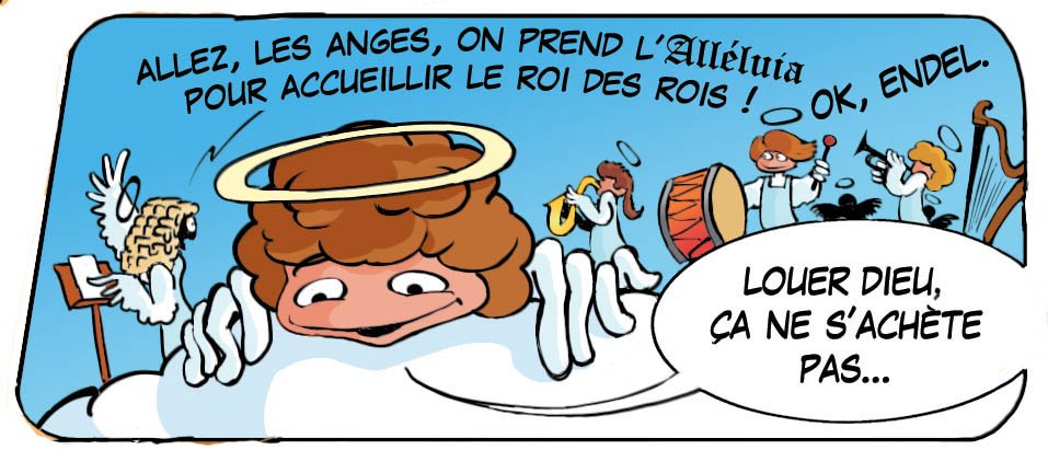 Et les anges se remettent à chanter la Gloire de Dieu, comme ils le faisaient dans l’album « nuit blanche à Bethléem », ce qui empêchait l’âne de la crèche de dormir…) Ps 46,8 Car Dieu est le roi de la terre : que vos musiques l’annoncent ! Le psaume 46 est un psaume que l’on chante …