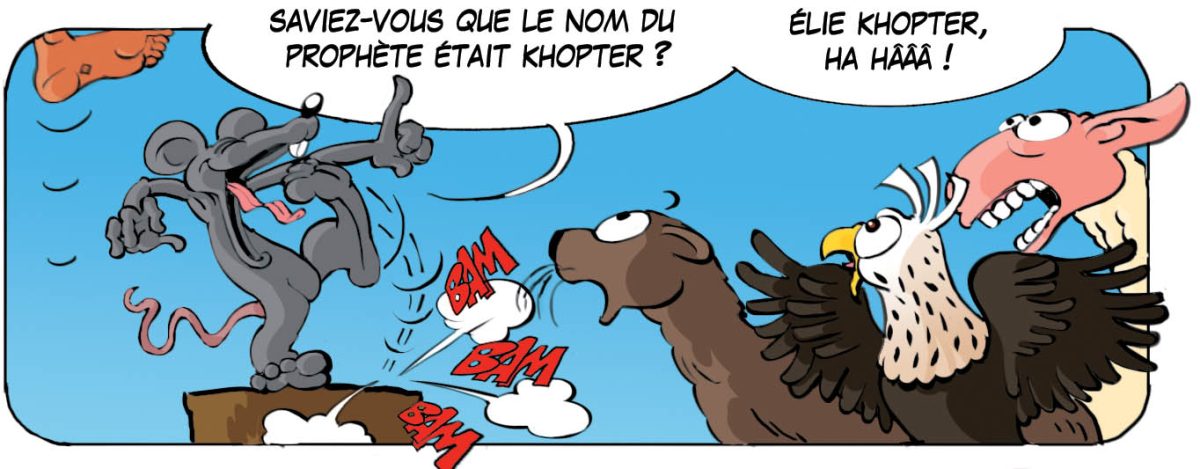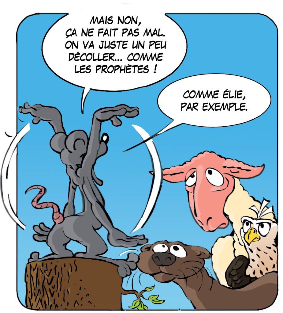 On voit Jésus s’élever de terre (son pied en-haut à gauche. Lc 24,51 tandis qu’il les bénissait, il se sépara d’eux et il était emporté au ciel. La souris, à la case d’avant, était en avance dans la foi par rapport aux autres animaux, mais elle tombe dans le piège d’attirer l’attention à elle …