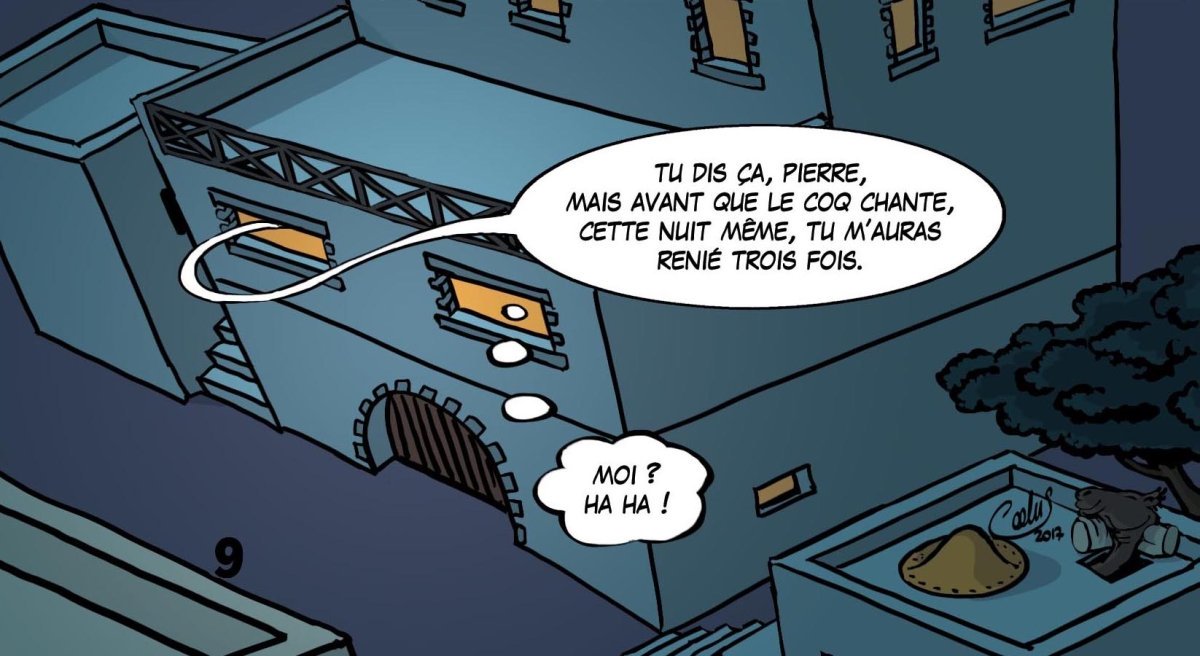 Mt 26,34 cette nuit même, avant que le coq chante, tu m’auras renié trois fois. L’angle de vue de cette image donne l’impression que cette maison chancelle et penche en avant. Elle n’est pas encore fondée sur le roc. Une fois que Pierre aura compris ses limites, la même maison sera montrée en contre plongée, …