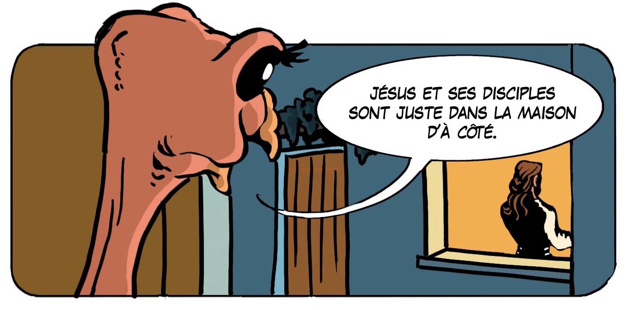 Cette fois-ci, l’autruche essaie de combler le vide qui la sépare de Jésus en tendant son cou pour ne perdre aucune parole. L’image est sobre, pour qu’on puisse réfléchir au texte. Effectivement, Jésus n’a pas dû bénir le repas de la Pâque comme le faisaient les autres rabbis…