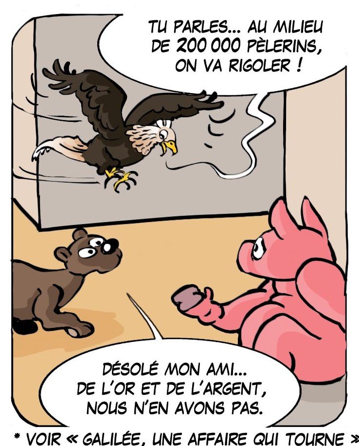 Le cochon qui fait la manche (pas facile de dessiner un cochon qui « ouvre la main » avec un sabot fourchu…) représente l’impotent qui mendie devant la Belle Porte et que Pierre et Jean vont guérir après la Résurrection de Jésus. Voilà pourquoi Pierre lui dit Ac 3,6 Pierre déclara : « De l’argent et de l’or, je …