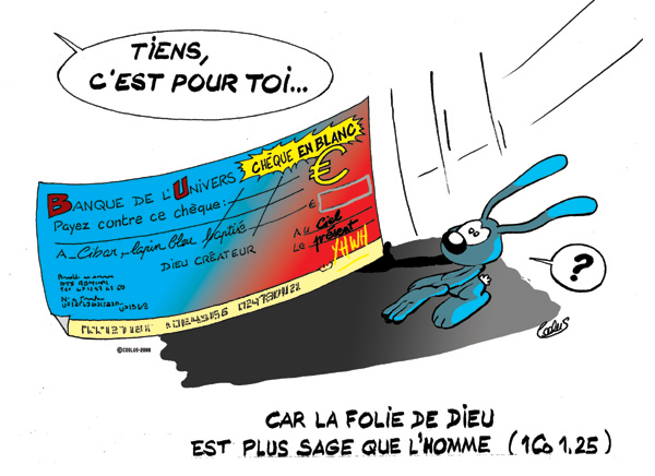 Jésus s’est incarné Juif, mais il aurait pu être incarné Tchèque ( « un carnet de chèques » ?) Première lecture : Exode 20,17 Psaume 18 Deuxième lecture : 1 Corinthiens 1,22-25 Evangile : Jean 2,13-25 Pour aller plus loin Détails -Un chèque en blanc descend du ciel. Il est spécifié qu’il s’adresse au lapin bleu baptisé. Quand …