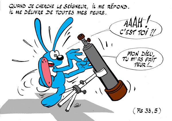 Hou-ouuuu ! c’est Dieu !! 1ère Lecture : 1 Rois 19,4-8 Psaume 33 2ème Lecture : Ephésiens 4,30- 5,2 Evangile : Jean 6,41-51 Pour aller plus loin Détails : -Ce lapin cherche Dieu, loin, très loin, très très loin (regarde la taille du télescope) -Il est surpris par quelqu’un (Dieu) qui est tout proche. -On reconnaît l’ombre …