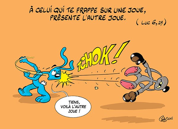 En joue ! 1 Samuel, 26, 2-23 Psaume 102 1 Corinthiens 15,45-49 Luc 6,27-38 Pour aller plus loin Détails -Le lapin gris vient de frapper le lapin bleu sur la joue droite. -Celui qui a reçu le coup, tend la joue gauche… un peu violemment et d’unité air innocent. Questions -J’ai déjà entendu …