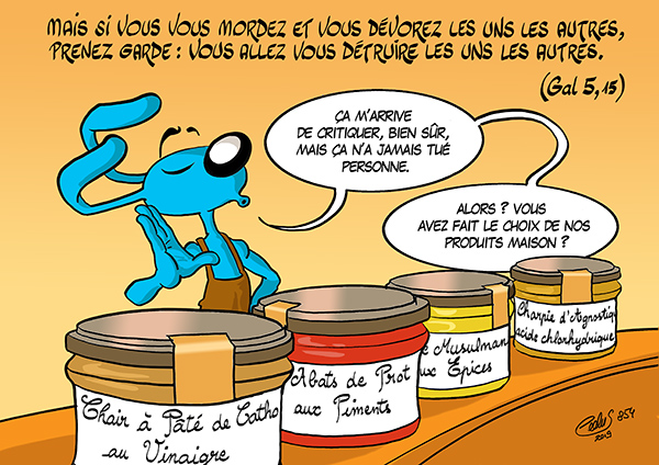 « Être dans le pâté »… Sens propre ou sens figuré ? 1ère lecture : 1 Rois 19,16 ; 19-21 Psaume 15 2ème lecture : Galates 5,1 ; 13-18 Evangile : Luc 9,51-62 Pour aller plus loin Détails -Le lapin admet qu’il lui arrive de critiquer… mais il ne trouve pas ça grave. -Il vend du …