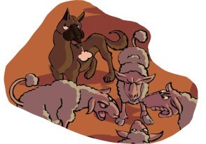 Toujours dans « Galilée, une affaire qui tourne », ce sont eux qui veulent croquer la brebis. On le retrouve dans un arbre, suspendus à une branche par Jésus, avec leurs queues liées entre elles. Elles le sont toujours.