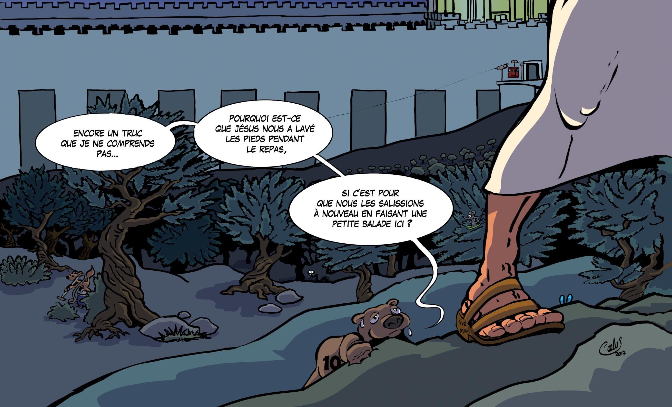 Jésus vient de laver les pieds aux disciples, d’où l’interrogation logique de Pierre. Si j’avais été à sa place, je me serais interrogé… D’ailleurs, c’est ce que j’ai fait dans la BD. Voici trois paroles Bibliques qui ont un rapport avec l’événement :