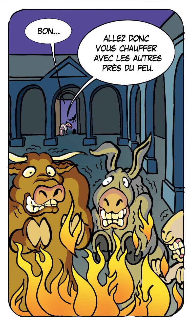 Voici encore une image où les animaux ont une posture d’êtres humains gelés: assis, recroquevillés, le corps tendu en avant, les pattes près du feu, les dents qui claquent…