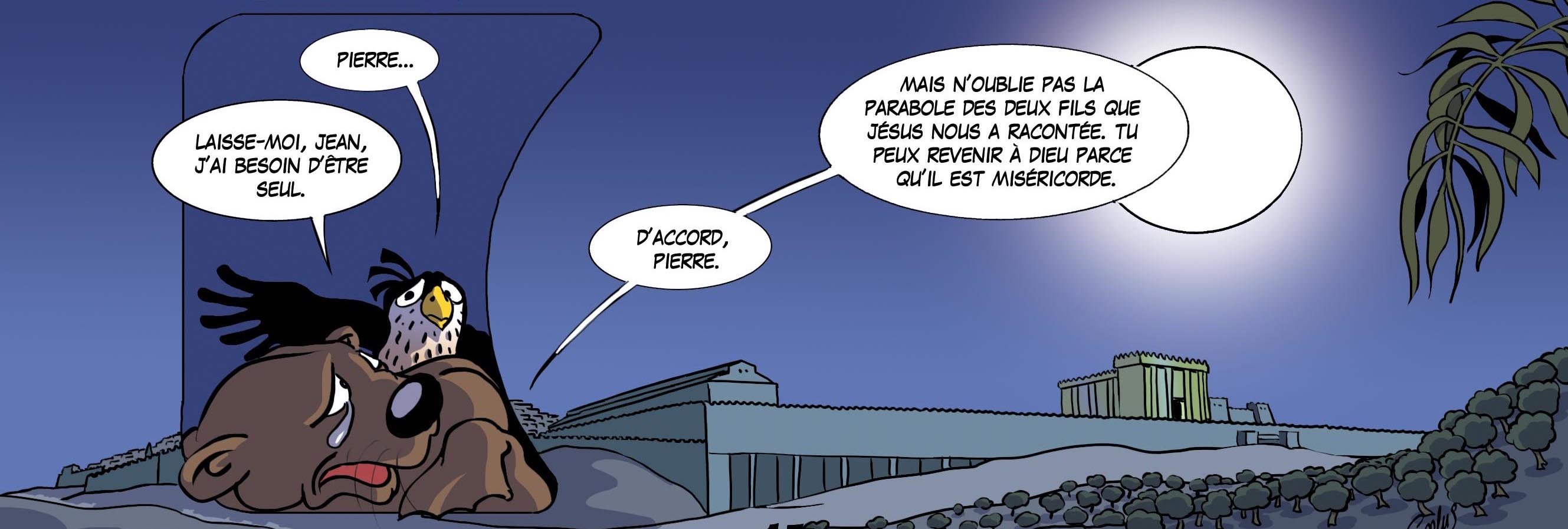 Jean essaie de rappeler à Pierre la parabole du fils qui était perdu et qui est revenu à la maison du Père pour accueillir son pardon.