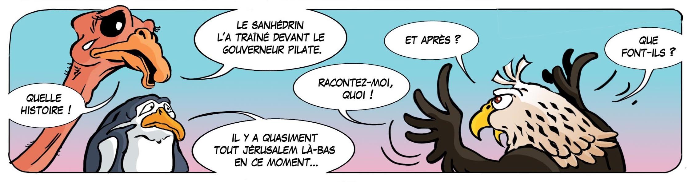 Les deux personnages de gauche sont dans tous leurs états. L’émotion gagne sur tout le reste. Ils racontent que Jésus est chez le gouverneur romain Ponce Pilate, celui qui a droit de vie ou de mort sur Jésus.