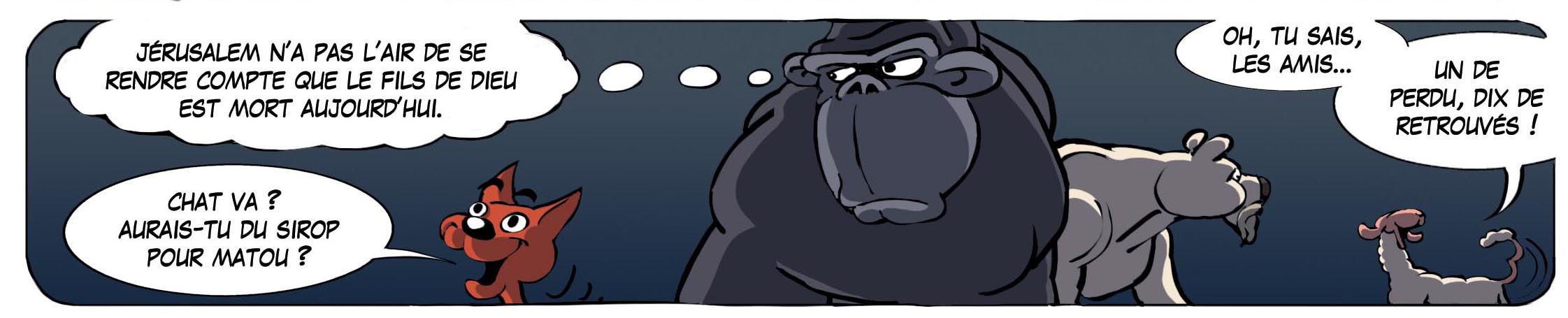 Nous pouvons sentir ce mal-être lorsque quelqu’un de proche est mort et qu’autour de nous, la joie des autres nous agresse parce qu’on n’a pas le coeur à rire. Et pourtant, oui, la vie continue. La vie est présente à droite et à gauche (où regardent l’ours et le gorille), devant et derrière (où sont les personnages secondaires).