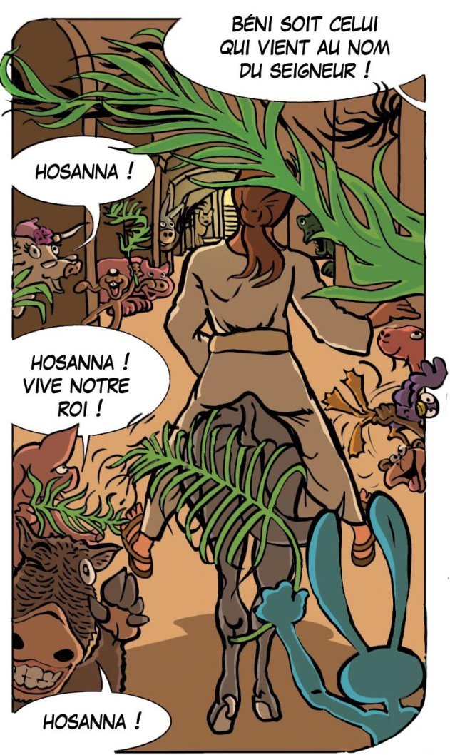 Jésus entre dans le Temple par le passage souterrain (qui débouche sur l’espèce de sortie de métro qu’on voit bien sur l’image 1 de cette page 3). Il est acclamé par la foule.