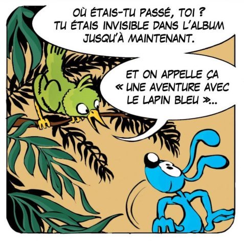Ce que dit l’oiseau est juste : pourquoi est-il écrit sur la couverture de cette BD « une aventure avec le lapin bleu », si on le voit si peu, ce lapin bleu ?