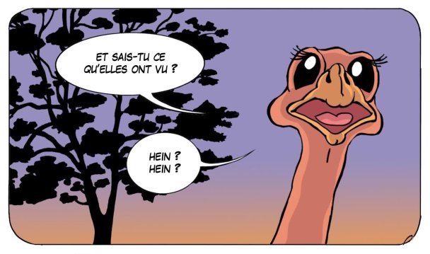 L’autruche a l’air de tenir un scoop, elle se redresse.