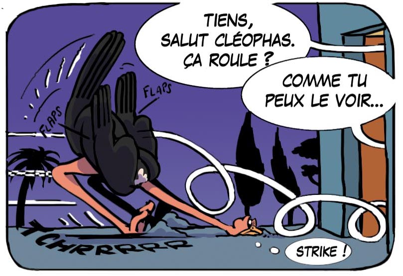 Cette image aurait pu être décomposée en trois cases avec trois actions mais elle aurait perdu en force de rapidité. Lorsque l’autruche dit « strike », elle fait allusion au bowling quand on lance la boule et qu’on fait tomber toutes les quilles. Ca laisse à l’imagination le soin de deviner ce qu’il pourrait y avoir à la case suivante.