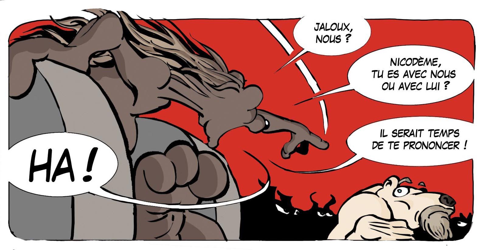 Là encore, la perspective renforce le pouvoir de Caïphe et le fait que Nicodème soit écrasé, entouré d’hostilité et de colère. Nicodème était allé trouver Jésus de nuit par peur que cela se sache (voir l’évangile de Jean au chapitre 3). On voit bien que Nicodème va être un jour amené à se prononcer. Ca viendra plus tard dans l’album.