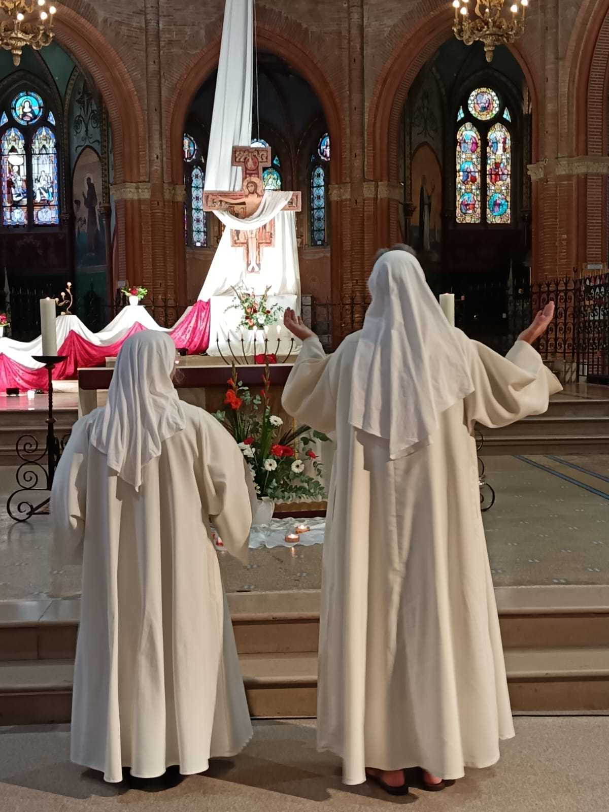 Il est heureux que nous soyons ici pour célébrer ce beau mystère de la Croix Glorieuse.Nous avons la chance cette année de le fêter pendant le grand jubilé de l’Espérance. Sr Jehanne Emmanuelle et moi-même avons la chance de fêter, en ces jours, notre jubilé : 25 ans de vie religieuse. C’est une joie de mettre notre petit jubilé dans le grand jubilé de l’Espérance, je dis petit jubilé car notre sr Anne Marie vient de fêter ses 70 ans de vie religieuse !